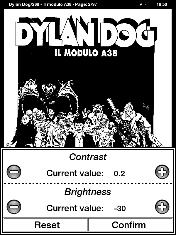 Image post-processing is now available both in portrait and in landscape mode. Settings are stored even if Komic is closed but not applied automatically when starting Komic. When choosing contrast and brightness, you need to press Confirm to apply changes (otherwise it would take ages to switch from one value to another). Settings are reset (contrast 0 and brightness 0) using Reset button. Once settings are changed, a new option appears in reading menu: this reverts to the original image aspect but keeps the settings stored. Post-processing is deactivated when choosing: - change page size - rotate image (in portrait mode) - zoom in & out using zoom buttons and is automatically activated when switching back to normal use. On the other hand, post-processing is automatically applied when jumping to page or when going to next/prev page. It works togheter with image-ratio feature (but it can works also alone! ).It adds some processing time to page turning though. This time is proportional to the page size not to the file size (AFAIK...). This means that when using post-processing, landscape mode is a bit slower than portrait mode. Using both image-ratio and post-processing features makes page turning a bit slow: I can't do anything (at least I don't know what to do). v2.1 is ready. I'm still testing everything and trimming the code to make it lighter. ![]() ![]() Here are some screenshots: |