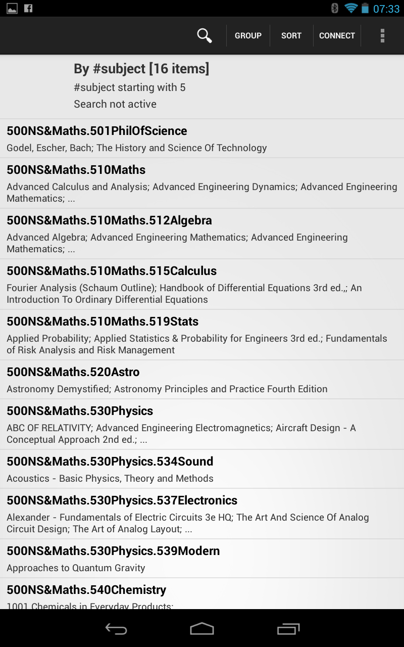 300Anthropology 500NaturalScience ...... 500NaturalScience.510Maths .............500NaturalScience.510Maths.512Algebra This provides “automatic” subject filtering in Calibre. I am trying to do the same in CC. The “OTB” CC gives me automatic Title, Author, Series (etc) Grouping. I added “#Subject” expecting the same to happen, but it seems to be treated very differently. I : 1. Click on “Group By #Subject” (expecting to see them grouped by …. Subject), 2. It prompts me to enter a search term. 3. I enter “512” (i.e. Algebra) 4. It tells me how many are in that “Group” but doesn’t display the list. 5. I THEN need to “Ungroup” them to display the list of books 6. I can then “Group By” (Author, Publisher etc) So instead of a ONE click action, it is now a six click process. It seems that the user custom “Group”, functions more as a “Filter” rather than a Group. Is that correct ? How can I get it to behave as an actual “Group” ? If I can’t “Custom Group”, then it would seem that I would need to copy the Subject to the Tag Field then use the Tags or some other way. Any thoughts ? Last edited by Glottalpoly; 11-20-2012 at 05:14 PM. |