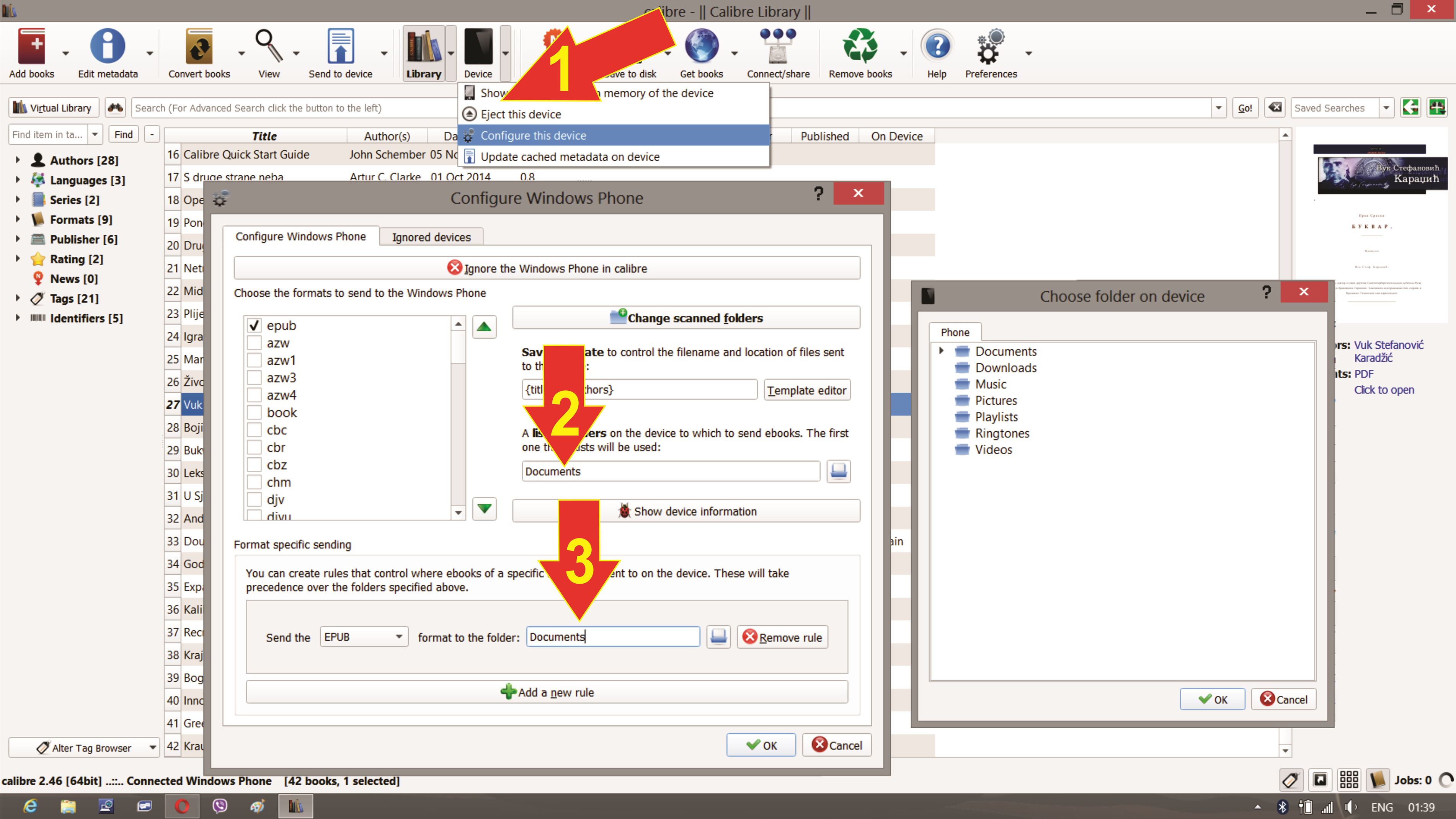 Maybe I write this post to late, maybe similar post exists on this forum still, but I want share my experience. I have Nokia Lumia 930 (WP 8.1) phone. It is very easy to connect and import books between Calibre and phone via USB cable. Problem is in WP 8.1 stupid rules: We can manage only some folders in windows phone: Documents, Downloads, Music, Pictures, Playlists, Ringtones and Videos. Tolham is right: calibre creates a folder on the phone called "books" with the ebooks inside, but this is apparently invisible to the windows phone. Because of this, you can change Calibre settings for device: 1. In Calibre menu choose “Device / configure this device”, 2. In “Configure windows phone” window, “A list of folders on the device to which to send ebooks” must be changed from “Books” to “Documents” or other visible WP 8 folder or subfolder, 3. Also, you can change folder name in “Format specific sending” rule from “Books” to “Documents”, 4. Reconnect phone and restart calibre and try to import some books. It will work! (P.S. I used Nokia lumia 930 - windows phone 8.1, USB cable, Tucan reader or Bookviser reader and it work very well / see attachment). |