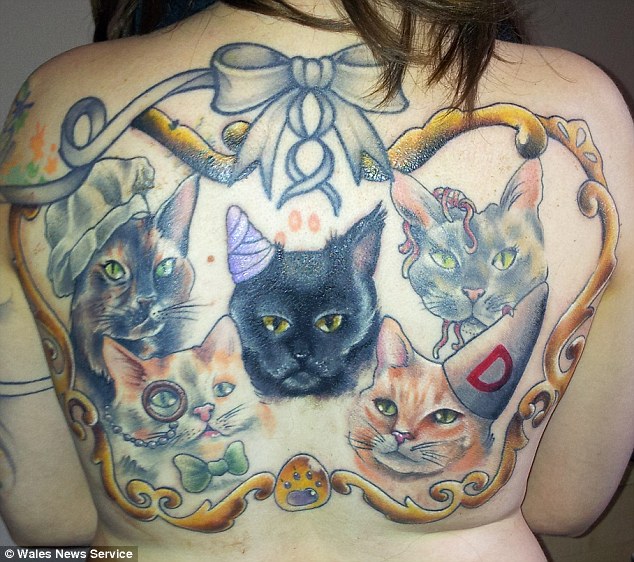 Animal lover Fran Bailey has the faces of her five dead cats tattooed on her back.