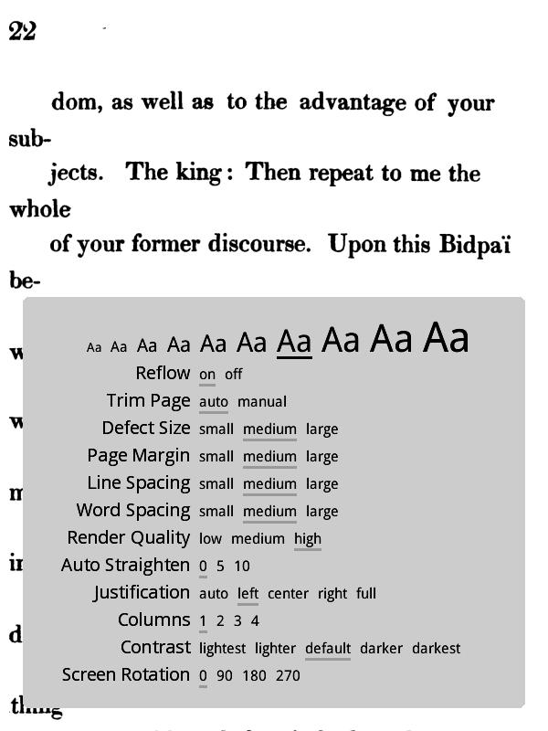 For example, when I tested this pdf from archive.org with it, I noticed that large chunks of text were often randomly carried over from one page to the next (p21_A.jpg & p21_B.jpg), which makes continuous reading rather difficult. Occasionally the Reflow feature also produced lines with just one word in it (p22_A.jpg). (All screen captures where taken in sequence on my K3, and you can see the settings that I used in the last screen capture.) |