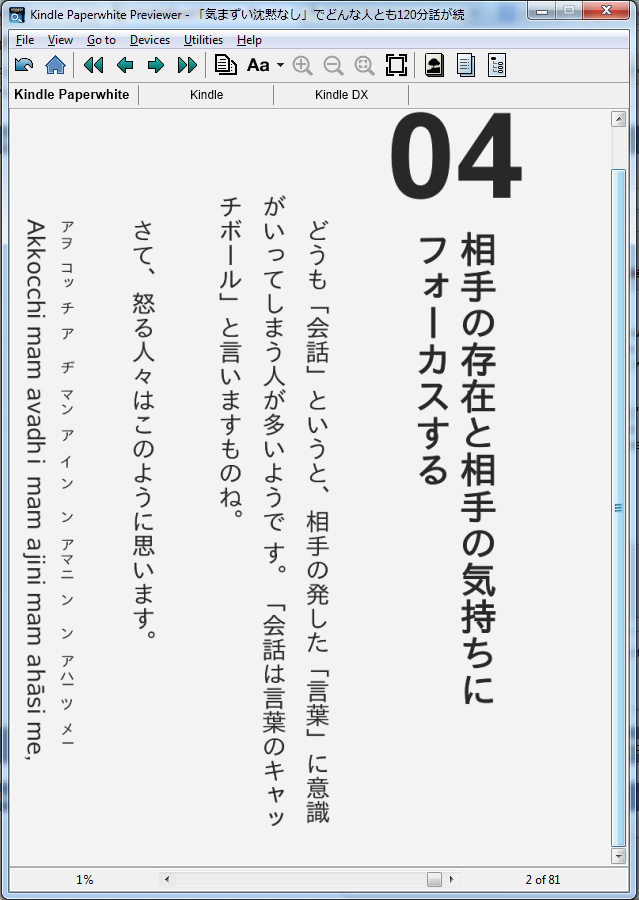 Thanks a lot. I finally found the problem with the <ruby> tag at my end. The embedded Japanese font I had was causing the characters inside the ruby tag not to be displayed. I might need to dig further why it happened since it only shows up on "vertical" writing mode or you might be correct that it might be an issue with KindlePreviewer. I'm using ePub3 code "-epub-writing-mode: vertical-rl;" in the CSS of the BODY tag to display the whole page in "vertical right to left". It works for "Kindle Paperwhite", ADE 2.+, and iBooks 3. I haven't gotten to testing it on the Nook or Kobo if it works on them too. |