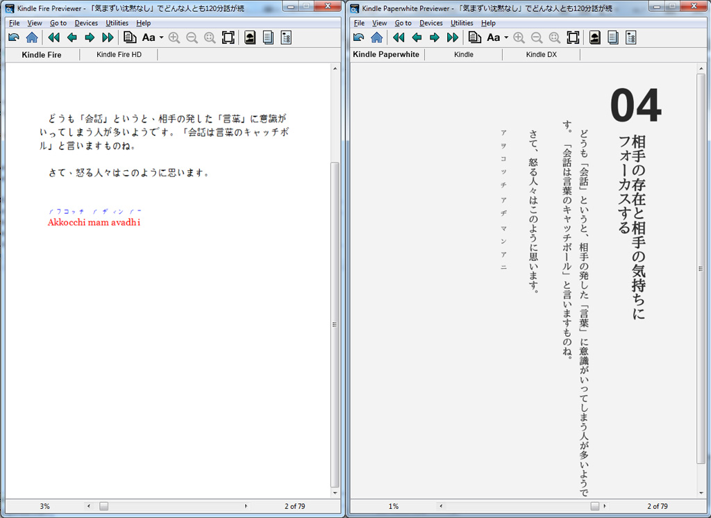 Thanks a lot. I finally found the problem with the <ruby> tag at my end. The embedded Japanese font I had was causing the characters inside the ruby tag not to be displayed. I might need to dig further why it happened since it only shows up on "vertical" writing mode or you might be correct that it might be an issue with KindlePreviewer. I'm using ePub3 code "-epub-writing-mode: vertical-rl;" in the CSS of the BODY tag to display the whole page in "vertical right to left". It works for "Kindle Paperwhite", ADE 2.+, and iBooks 3. I haven't gotten to testing it on the Nook or Kobo if it works on them too. |
