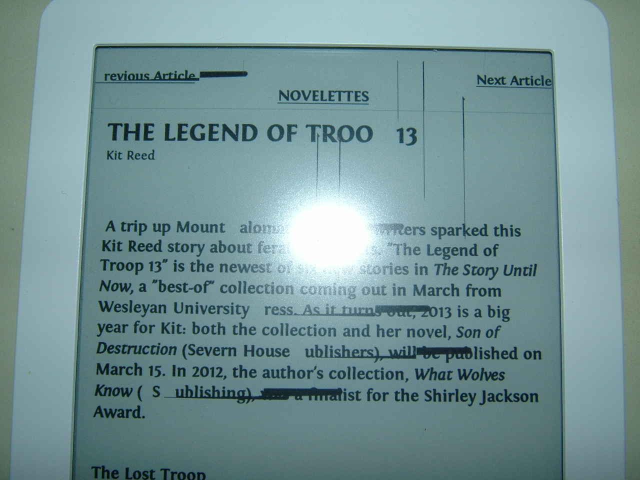 I thought I had broken my Glo's screen - it was displaying some pages with a lot of black horizontal and vertical lines (see the pic below) It turns out that this was due to the Fontin font that I had adjusted; I had increased the weight of the font (Regular, Italic, Bold, and BoldItalic) but the Glo was not happy with the increased weight in the Bold and BoldItalic. Strangely, the problem has only manifested itself in one book so far.