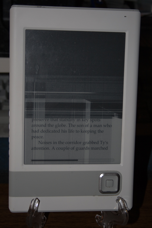 Yep. It's toast. However, I have a 64MB and a 512MB Cybook in reserve. The real thing that bothers me is that I quite literally picked it up, turned it on, and selected an ebook and the screen broke. SCARY! ![]() Derek |
