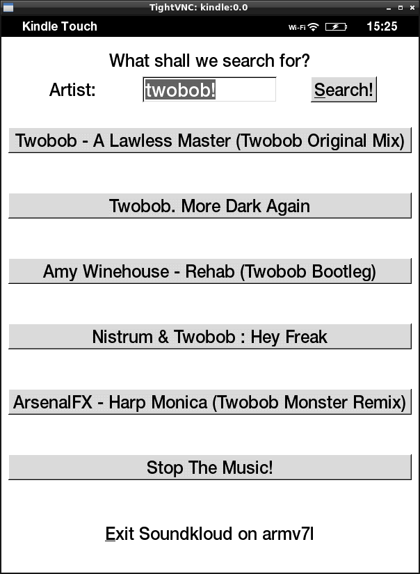The gui is the issue. since on the 3 the level of separation of the kindlet from the python layer makes handling updated files require some home-brewed methods of file watching. It's also tricky to test locally. As the gui won't "run" on a pc, without wrapping it in something (the snake game amongst others does actually have examples of this) so - to recap - I don't want to do it as a kindlet. I will repurpose this code to be a launcher for the Gnuboy games on the 3 perhaps. So what do we use? And how do we get around the separation from python. One thought would be to implement a pure c interface to the soundcloud API. as it happens someone did this a few years back - hopefully the code isn't too rotten. It was... Spoiler: