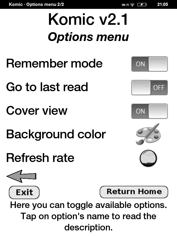 First new feature for the v2.2 will be the customizable screen refresh rate! ![]() More to come (free memory when needed, no more filename pattern, all GUI launcher scripts inside Komic itself....)!!! |