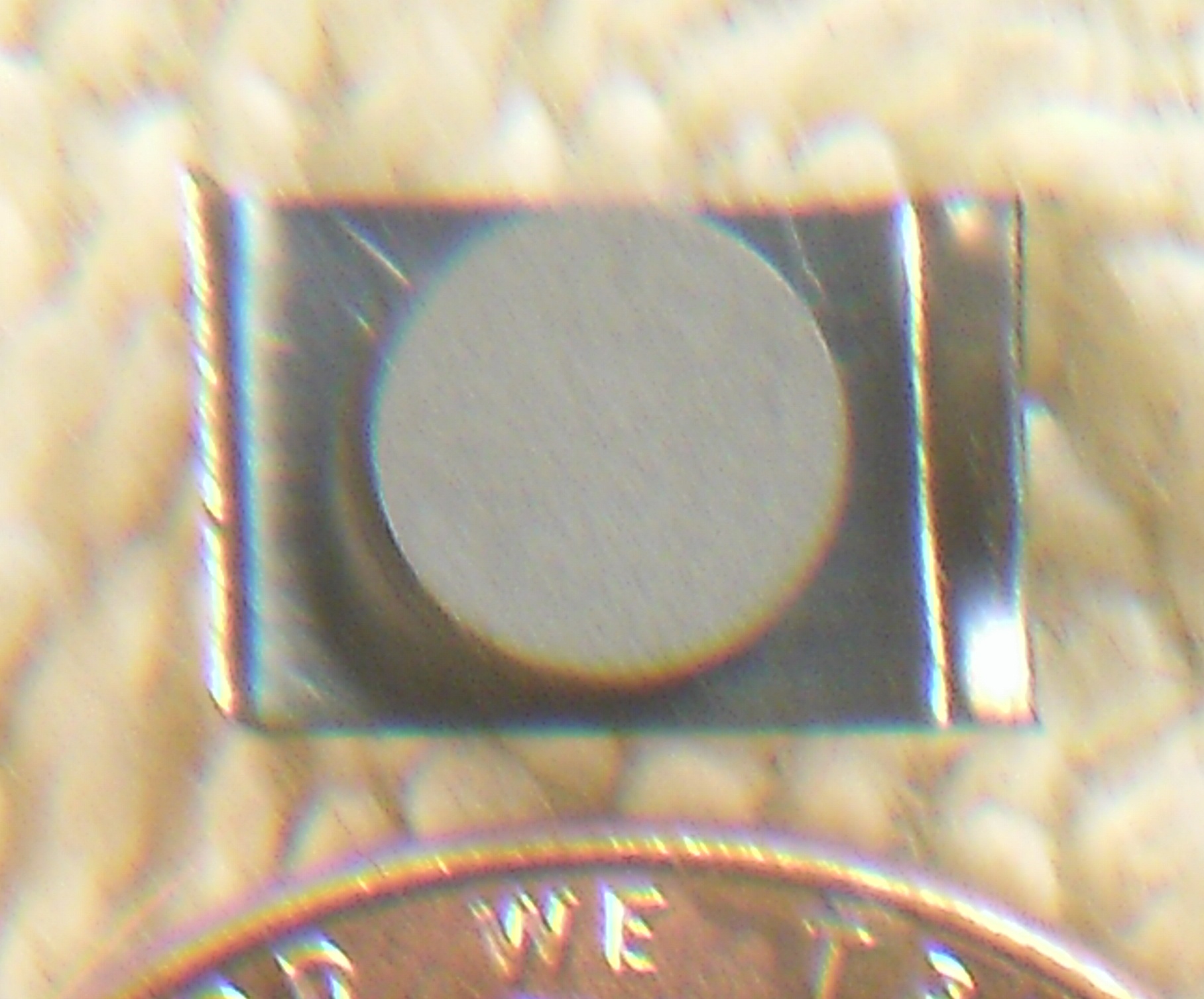 When ordering my Kpw I had the choice of a $20 case without a sleep/wake magnet or a $40 case with the sleep/wake magnet. Duh... I admit it - I'm cheap - I got the $20 with the intent to add my own magnet. After trying to make my own - I broke down an bought a magnet. RadioShack part number: 64-1895 - a pack of two rare earth magnets for $2.19. Each magnet is 3/16 (4.8mm) diameter and 1/16 inch thick. Rather strong for their size: 10,000 gauss. Much stronger and much smaller than the refrigerator magnet (which I had been using). WARNING: Do not allow your credit cards (or any mag-strip card) to come close to this magnet! That is: Don't put them in the case with your Kpw - you might just as well burn them. The "natural" lines of force are from flat face to flat face. This will wake the Kpw - but it would work much better if the lines of force where parallel to the case surface. To do that, I made a "U" shaped, sheet steel, frame to bring the end face of the magnet that would be furthest away from the Kpw down to the surface. The "legs" of the "U" are slightly longer than the thickness of the magnet. There is a drop of "super glue" between the magnet and the steel frame. Just to keep the magnet from sliding out of place over time. (Sliding it is the only way to get it off - 10,000 gauss is a lot of "pull"). With a US penny as a reference to the size of this device: Pic: 1 - The rare earth magnet. Pic: 2 - The steel frame. Pic: 3 - The magnet inserted into (onto?) the frame. Note that the frame is about 2x the width of the magnet - This is a requirement. Pic: 4 - A side view of the assembly. Note that the legs are slightly longer than the magnet is thick - This is a requirement. Pic: 5 - Put it there. Bring this assembly (open side towards Kpw) within 1/4 inch of the Kpw and it goes to sleep (from either "run" or from "off"). Final assembly will be to recess it into the foam liner of the zipper case with a touch of glue to hold things in-place. Last edited by knc1; 01-07-2013 at 01:12 PM. |
