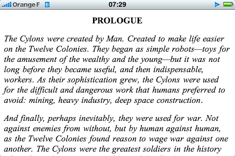 A note for daffy4u--Stanza (and now) eReader allows you to have black background with light text. As far as I can tell, Stanza gave me more control over both the foreground color as well as the font size, but eReader's options were suitable. I think the JPGs are blurred compared with what it looks like on the iPhone itself. |