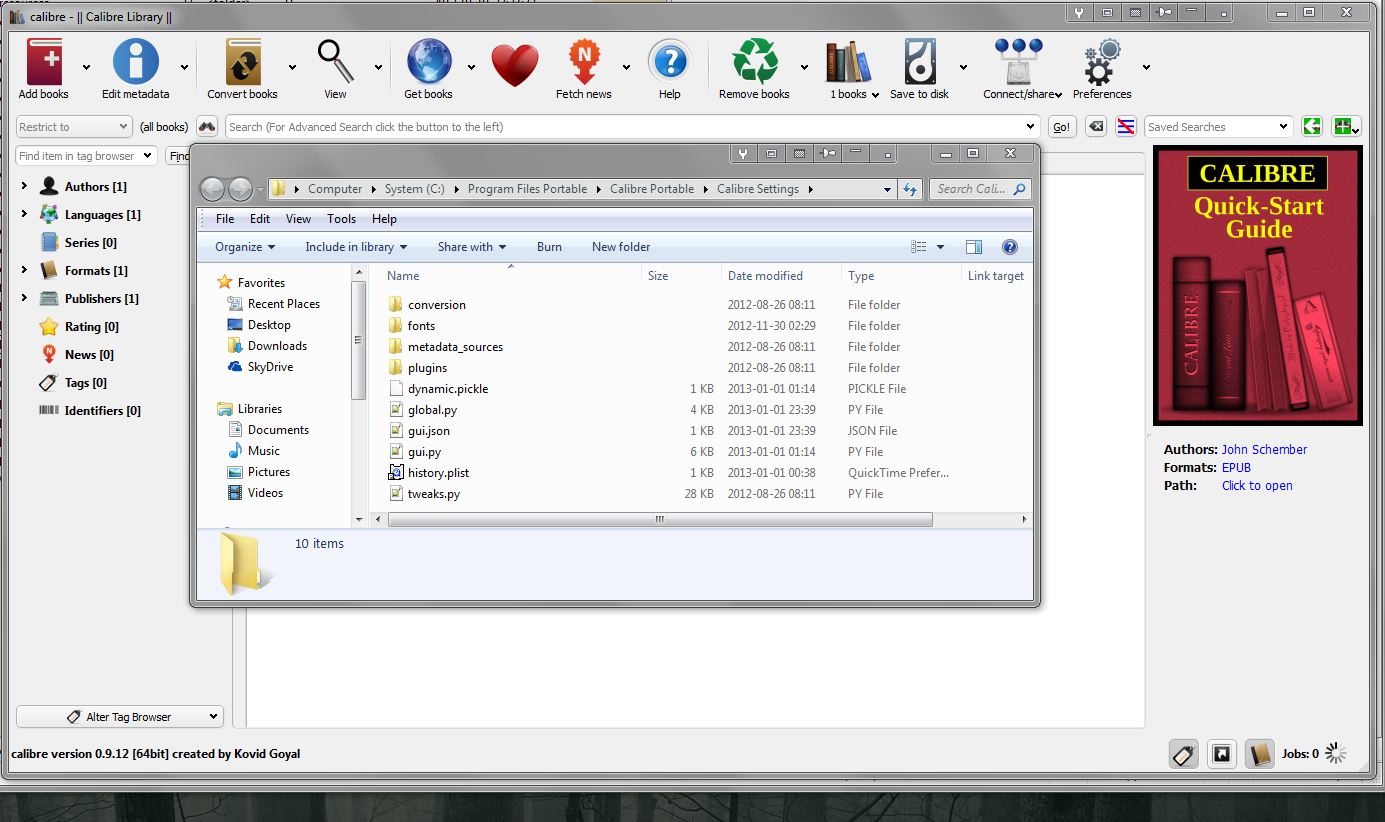 Portable requires the first (default-starting) Library to be where it is, You can have additional libraries with portable. Nothingness Calibre will recreate the configuration folder if missing from the expected location. There are 23 folders in my Local Settings\application data There are 39 folders in my Application Data Ubuntu puts things in the dot config folder Unless you have taken steps to set your OS to use alternate locations for system type folders |
