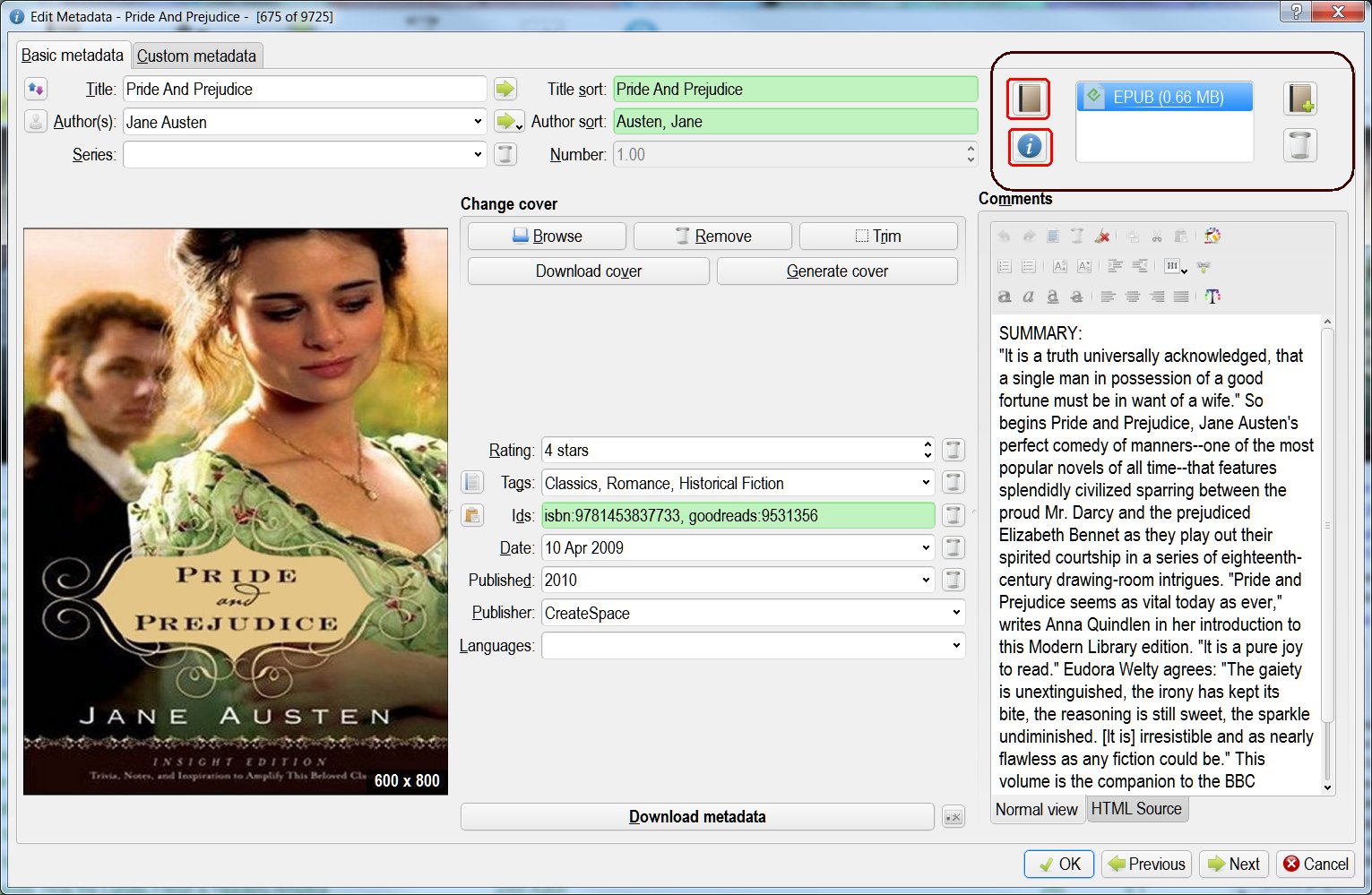 Now you can select a book and open the Edit Metadata window. Here you can select a format in the formats section and click on either of two icons to the left of the formats section to extract the cover from the book or use the metadata from the book (all metadata doesn't discriminate between fields).