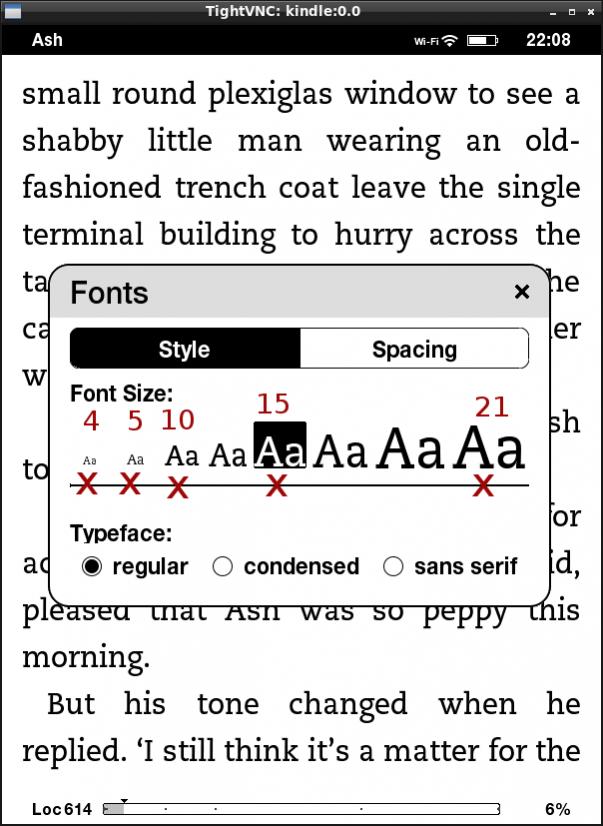 Setting font size to 15 does not work with .azw3 book (while 14 or 16 is OK).