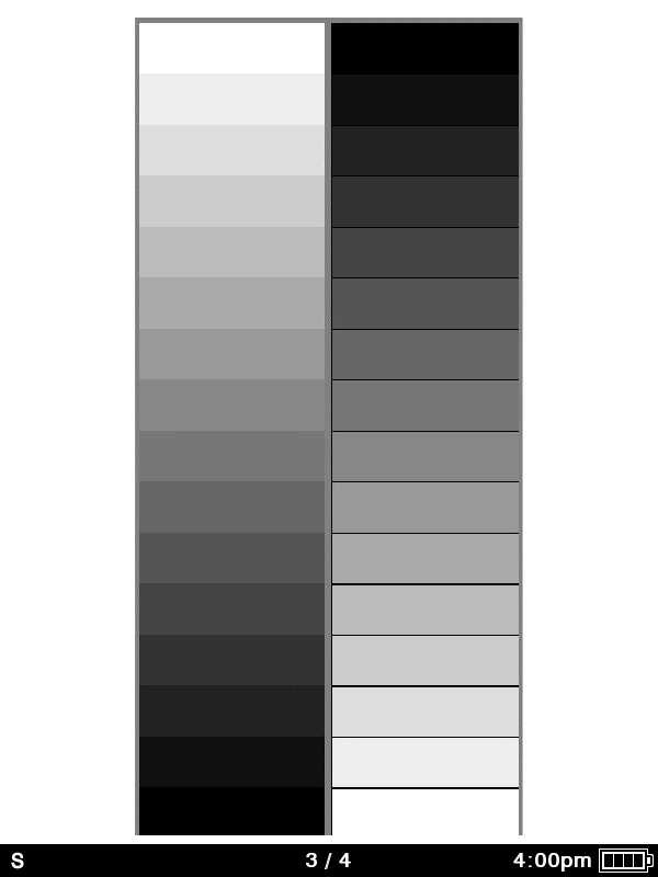 Perhaps a better test might be to use one of the images from this post. I used the 2nd image from the first post and stuck it into the epub and tried again. This time, all 16 shades were visible on even the default or lightest settings for my reader. Maybe it's just a case of the original greys not having enough variance between them, so they don't include the 16 shades of grey that e-ink will display, if I'm making sense how I'm trying to describe it. |