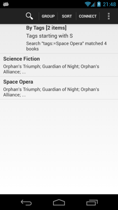 The first shows grouping by tags/first letter. The second shows the result of a long press on "S". This is the dialog that you see, giving you the choice of finding all books that match the item or all books that do not match the item. I tapped the "Matching" button, which says find books with a tag beginning with "S". The books have other tags, so those tags are shown as well. The header shows the calibre- and CC-equivalent search. If I wanted to I could change the grouping to by Series, by Author, or by anything. I could even turn off grouping. I would see only the books that have a tag beginning with S. This behavior is like calibre's restriction, in case you have ever used that. @Dopedangel: this is how you would view authors of books tagged with "Fantasy". You would long tap on Fantasy, select "Matching" to get the books with that tag, then group by Authors. The next screen shows what happens if I tap "Not matching", which finds all books without a tag beginning with "S". The header now has a "not" in the search string to tell you what it is doing. Note that there are no longer any "S" tags in the list, which is good because we asked for books with no tags beginning with "S". For the next screen, I cleared the search and then tapped on the tag "S" to open the list of tags beginning with S. I see three tags, one of which is not related to science fiction. I then long tapped on "Space Opera" and chose "Match", which selected all books with that tag. All my books with the tag "Space Opera" also have the tag "Science Fiction". The last screen shows what I see if I chose "Not match". I see all the books that do not have the tag "Space Opera". Note that the list of books with the Science Fiction tag is different from the screen shot above, because it is now showing books with "Science Fiction" but without "Space Opera". The non-fiction tag also appeared. Does this make sense to people? I know that it is hard to really know what something does without being able to play with it, but it would be a shame if I got this wrong coming out of the gate. |