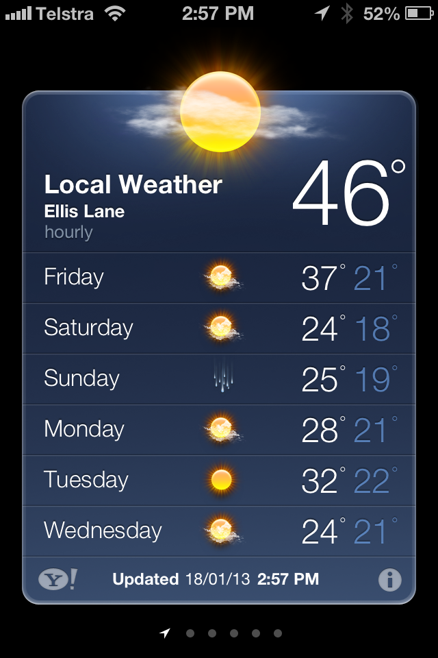 When I came home the parrots were looking at the bird bath but could do nothing with it. The temperature of the water was probably about 50. They were standing around with the bell birds mouth open wings out gasping. They really appreciated the sprinklers. So did I. Closest fire was a grass fire 15km away. So far so good. Are you close to any bush? And of course the air conditioner went on the fritz! Last edited by wannabee; 01-18-2013 at 06:08 AM. Reason: A/c update |