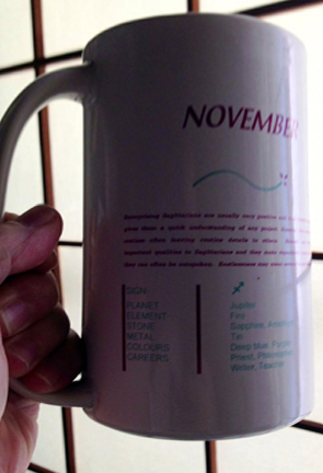 What would you do if I sang out of tune,Would you stand up and walk out on me. Lend me your ears and I'll sing you a song, And I'll try not to sing out of key. Oh I get by with a little help from my friends, Mmm,I get high with a little help from my friends, Mmm, I'm gonna try with a little help from my friends. ![]() ( https://www.youtube.com/watch?v=3xJWxPE8G2c ) Joe Cocker at Woodstock... They made history together. Good morning, everyone! The 4th Thursday in a month that has five. There is something very important in that, but I'm not sure what it is... I just 'feel' it. But it's starting off with a great big mug (see attachment below. Although the mug says 'November,' my birthday is in December. The shop only carried November mugs. I'm not fussy. ) of Taylors of Harrogate's "Yorkshire" tea, which is the perfect way to start the day. It's strong enough to remove paint from a battleship. It is definitely 'wake up' stuff! Add to it some rice, Kalamata olives and miso soup, and I'll be ready for the 10k walk we have planned for this morning. I need to be back before noon to meet with my Senior Citizen's conversation group, but that shouldn't be a problem if we walk fast!Quote: