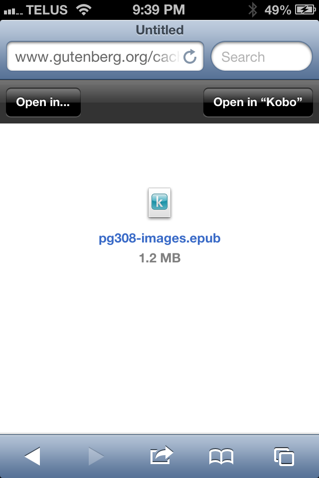 Maybe I'm missing something, but if the book is corrupt (or very badly formatted anyway) as you describe in your first post, maybe that's why Safari won't download it? Or if you get to the next step, maybe Safari will download it as Safari downloads anything you tell it to, but the Kobo app isn't suggested because the book isn't recognised as an epub, due to its bad formatting... That's what I would guess anyway. If that's the problem you'll have to fix the book with your computer (Calibre, Sigil, or other) to be able to read it. |