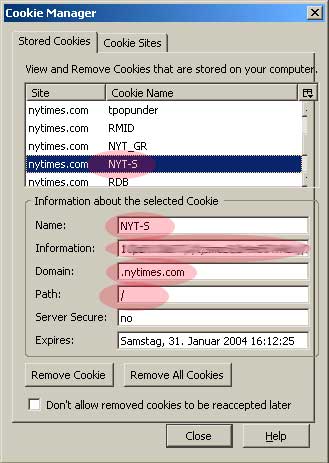 Dude, u Rock! Fascinating.For those who dont want to d/l mozilla (in this instance) since you know which cookies you need, go to your cookies directory in documents & settings find the NYTimes cookie file (mine's called microsoft user@nytimes[2].txt) and open it in notepad. The values are seperated by a black squares. The fiirst value after the cookie name is the value you need. Remainder of instructions above. |