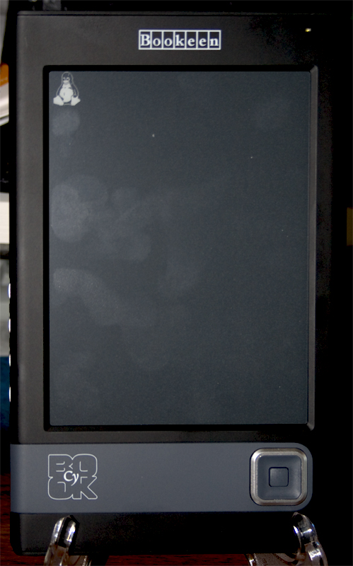 As you all may know, Open Inkpot (OI) is creating a nice Linux variant for the various e-ink readers out there. Ondrej is working on the port to the Cybook family of readers (from Bookeen, Ganaxa, Orsio, STAReBOOK, Astak, Netronix, etc.) He's gotten to the point where he can get the Linux kernel running and displaying Tux. He graciously loaned me a copy and I just got done running the kernel on both my Cybook Gen3 (the 512MB model) and my EB-100 from Netronix. I've taken pictures of Tux happily appearing on the display and I'm posting them here.