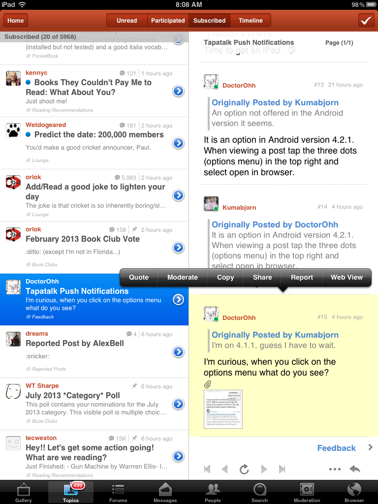 It seems to work a bit different in Tapatalk HD for iPad. Here's what it looks like when you've selected a post using that app. Selecting "Web View" opens the post in a separate Tapatalk window with all the normal options you'd see in a browser.