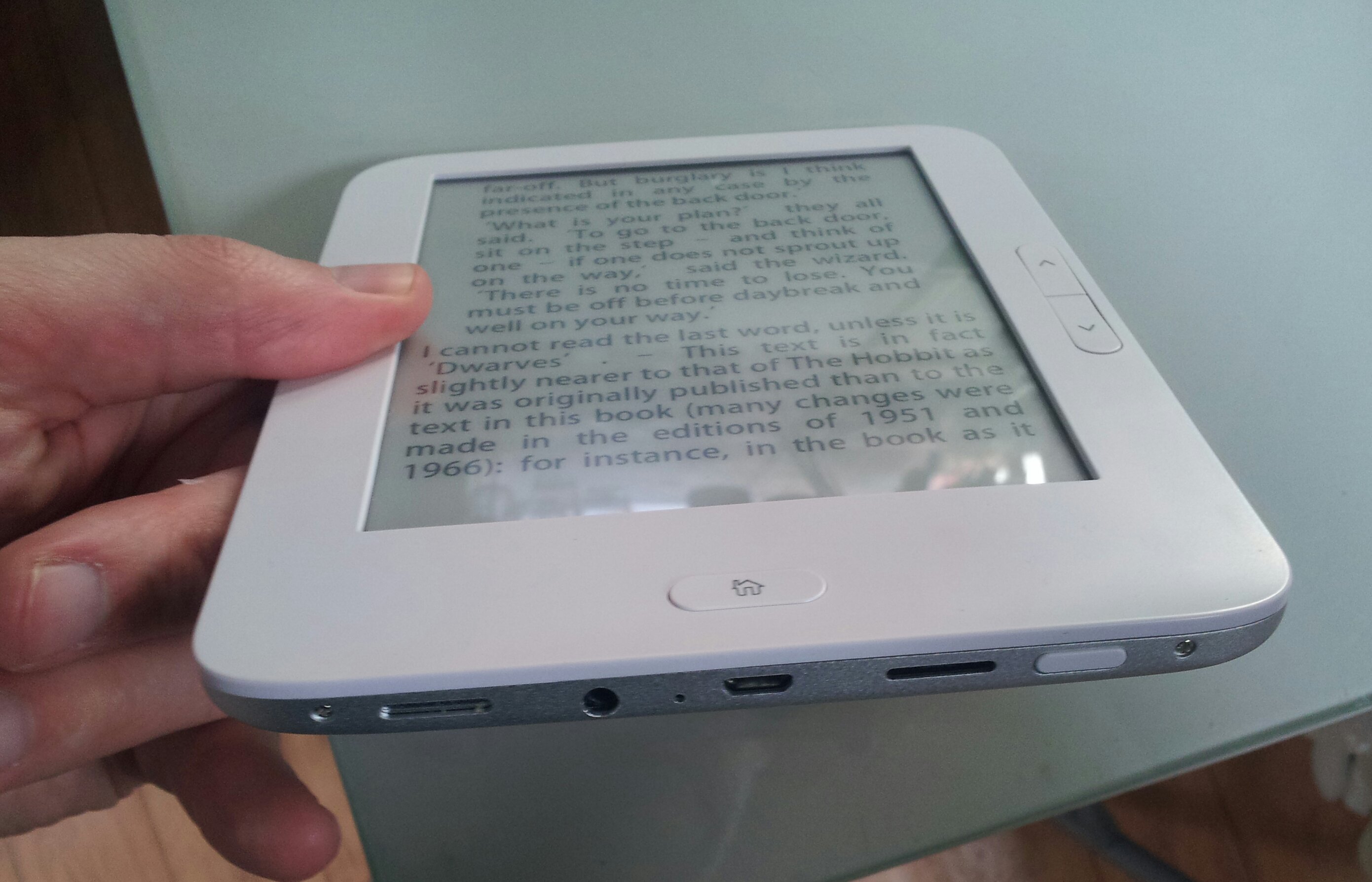 I tried to instal .apk files with the file manager that the device came with but no luck. It simply says "invalid file." Moreover, there is no setting for "non-market apps" like there is on my android phone. I looked around on the internet last night but not really sure about how else to install apk files. If anyone has some suggestions, I'd like to hear them. The inbuilt reading app not only has Chinese menus, it is clunky and has none of the functions found in the Onyx software. The only advantage of android is for third-party apps. The fact that there's no obvious way to put third-party apps on here is just a waste, in my opnion. Here's a couple pictures. The back is a rough feeling metal finish. Because of this metal, the USB connection port scraps a little and thus makes my skin crawl whenever I insert a cable, ha ha, but otherwise the device itself seems okay. The glare on the screen, however, is a major problem. If I could install android apps such as Kindle or Google Books, I could live with the screen (it is still better than a tablet LCD) but as it is, the Onyx screen looks better and has way better software. Oh, and I checked out cloud reading but it said that the device's browser is not compatible. Like I said above, an interesting little device. It is fast but without third market apps it is useless. |