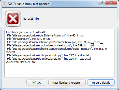 P.S. This screendump was made with the PRS-T1. Apparently the renderer renders the whole 'screen' in the shown image. In reality the screen only shows half of the grey area next to the black header box. The rest must be "swiped" into focus. 2) Changed $config['cops_update_epub-metadata'] = "0"; in Config local to "1" This results in both Calibre and PRS-T1 not being able to display epubs downloaded on eReader or through webbrowser on my PC. Calibre shows the error below. Reverting back to "0" will fix the epub (but obviously omits the updated metadata) 3) Sorting of book titles through the dropdown box is impossible on PRS-T1. The dropdown box that shows when pushing on the gear does not want to disappear once it is shown. I guess it is a rendering problem of the browser included on the eReader. Would be nice to have a solution for this, but it is not high on the wish list ;-) Other 'wish list' feature: - possibility to access other databases. I currently have a dutch and english database. I currently solved it by making separate instances in the web folder i.e.: /web/calibre_dutch/ /web/calibre_english/ Would be nice to switch from within 1 instance of the COPS server. Again: not high on the prio list. Last edited by Northguy; 02-04-2013 at 03:47 PM. Reason: Embedded pictures on Mobileread server |