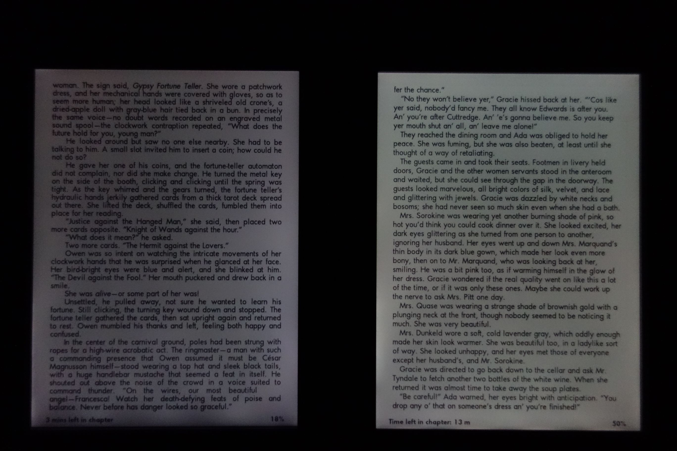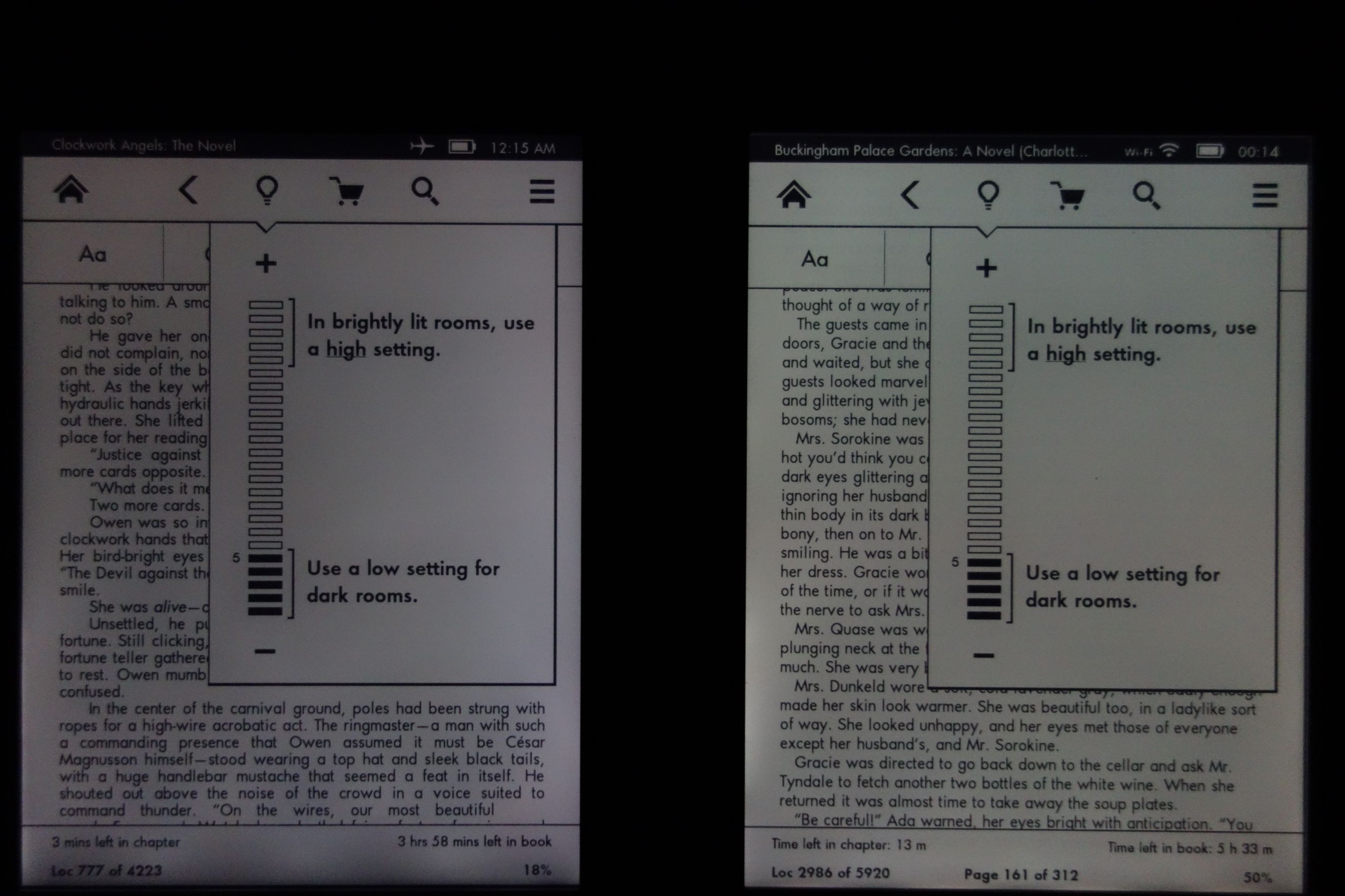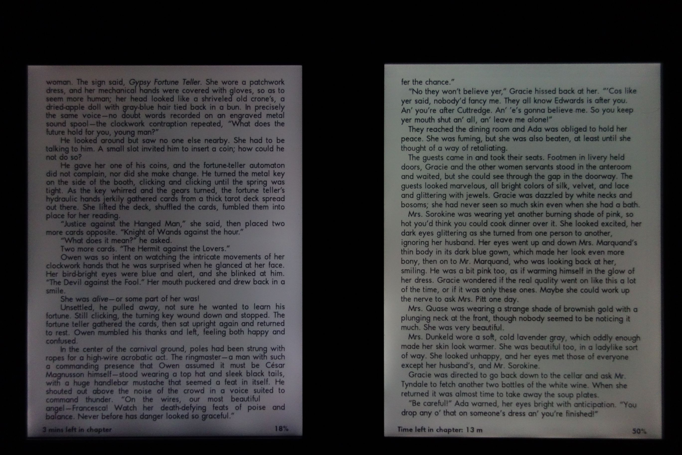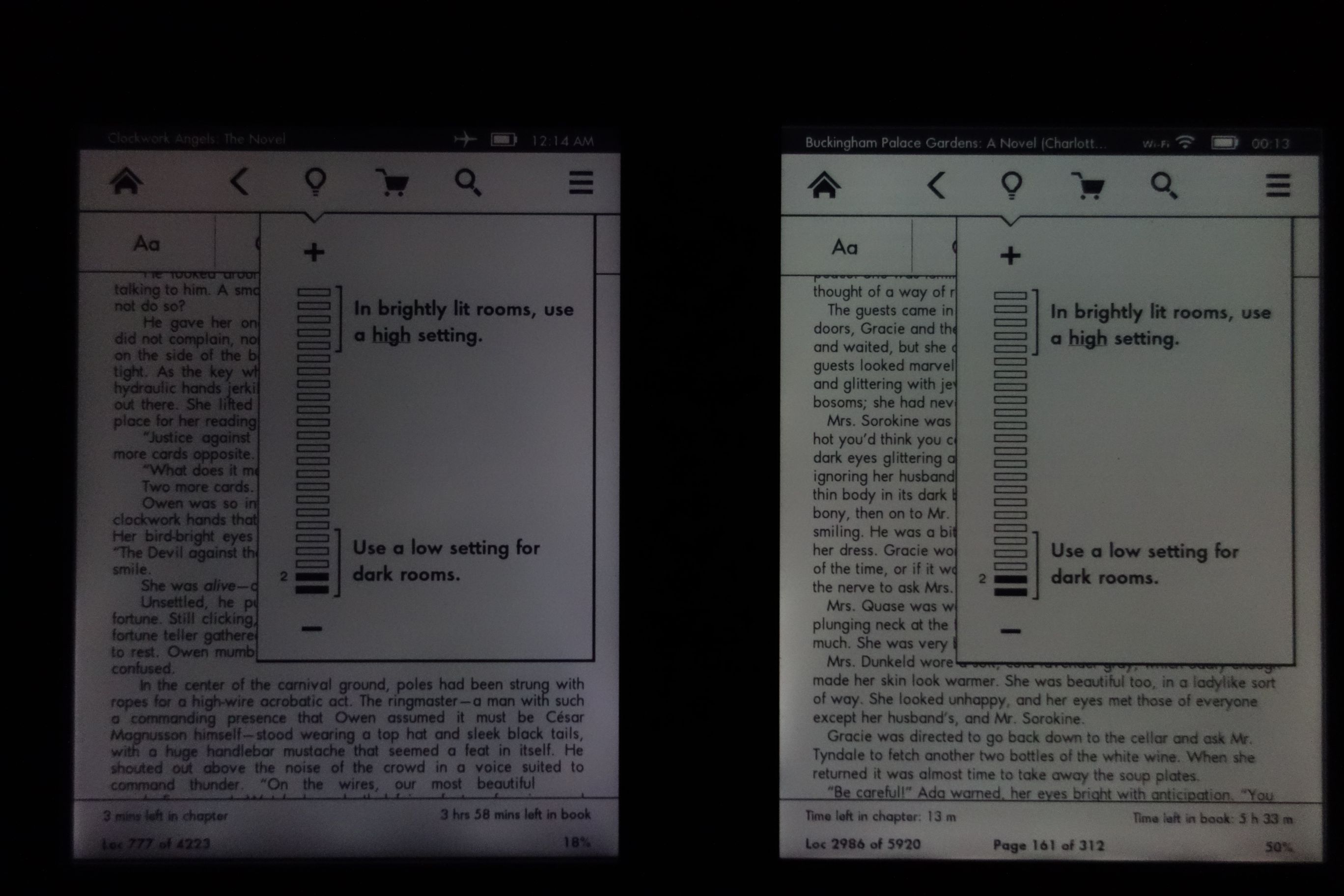 Both have excellent contrast (compared the 3rd Kindle that I'm sending back), but the one on the right is better and has a warmer hue. More obvious in the photo is that the one on the right has more even lighting and is brighter when set to the same levels as the one on the left. In addition, the one on the left has a slightly misaligned bezel and loose case (clicks when squeezed, as if it wasn't quite glued right). The quality variations between units are a bit of a let down, but I really like the Kindle Paperwhite (better DPI and UI than previous models). |