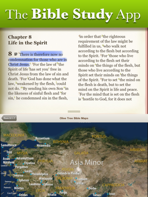 Here is what I like best about Olive Tree's Bible+ app: you can open 2 books at the same time in it! See the first screenshot attached to this message. You can pull up the screen divider from the bottom, to determine how tall the second (lower) pane should be. I think someone requested this ability from Marvin earlier in this thread: ability to open and display 2 Marvin books at the same time. To achieve that, I currently use 2 iPads. That's not necessarily "worse", because at least you can enjoy both books in full-screen mode. On many occasions, though, it would be more convenient to have both books displayed on the same screen. It would be, for example, ideal if you wish to read a book in a foreign language you're learning. The upper pane would show the book in the original language, while the lower pane would display the translation of that same book in your native language. That would be a great learning tool! Olive Tree's Bible+ app is even so smart that when you flip a page in the upper section of the screen, it also automatically flips the page in the lower section of the screen, so that the same passage is displayed in both screen sections. (Naturally, that's easier to achieve for Biblical editions, thanks to the availability of numbered Bible verses, but Marvin might at least approximate something like that using the book's overall % as location.) The second screenshot shows a map in the lower section of the screen, but that seems like Olive Tree's internal map, not a Google Earth map or Apple Map. So that it's the app's internal content again. If Kris could somehow arrange for the content of a 3rd-party dictionary app to be displayed in that lower section of the screen, that would be great. So, ideally, what would happen, would be:
