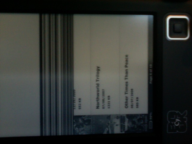 ![]() But the ruler-straight horizontal lines looked controller-related to me too, glad I'm not alone (Has anyone gotten successful controller replacement from bookeen or BoB? The threads all seem to be "yep, its controller failure, but I had to pay anyway"..)The last day of life went roughly like this: - wake up, carry downstairs (actually the wif did that, I'm on crutches again) and set it on the table. it got moved to a different room and read off and on for a couple hours - it got left alone a few hours indoors while we were gone (in it's case on a table, pet-free etc) - then carried it outside and set on the back seat of the jeeeeep for an hour (dinner) roughly 85 degrees, evening (no sun, no superheating, etc) - carried inside, it sat on a table for an hour - I turned on just before bed (boot time is annoying, so I generally turn it on before going upstairs) -- boom. looked like the pic. Psuedo-related note - anyone use the eCaddy with the new leather case? |