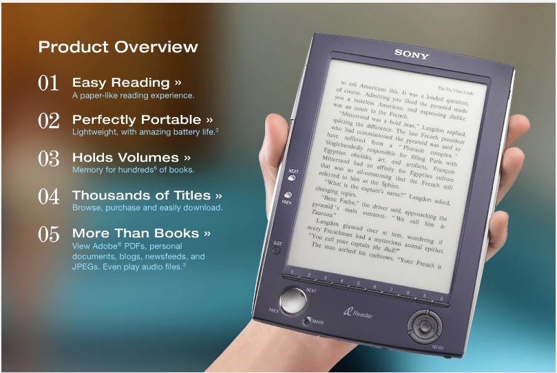 Here's the first glimpse of Sony's soon-to-be released e-book reader, courtesy of Rick Wilking from Reuters. The device's name: Reader. Expect more details soon as CES gets underway.Update: Sony has officially announced the Reader in this press release and there is an official product website here. Specifications and features: