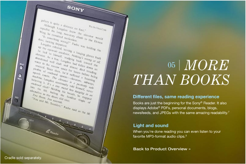 When the Sony Librie came out (April 2004), it was available at a SRP of 47900 Yen. With a currency rate of 1 Yen = USD 0.009365 at that time, the Sony Librie did come out at ~ USD $450.00. The pricing for the Sony Reader is quoted at USD $300-400. The price drop isn't that significant to me. |