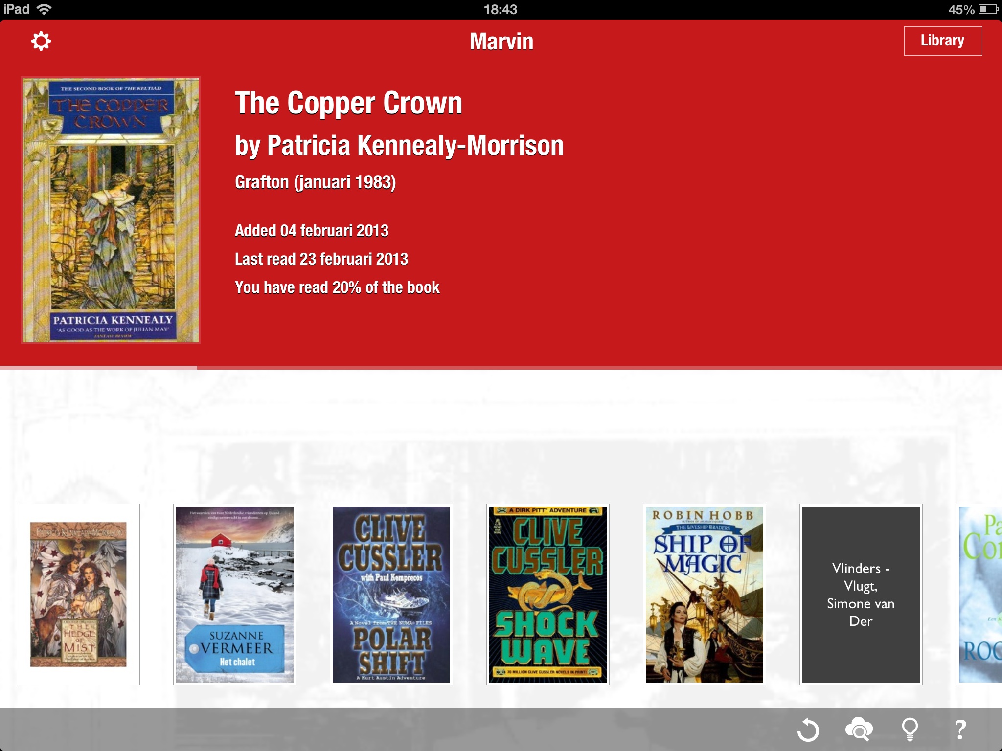 When i open Marvin i see all the books i have read until that moment. My idee is to reuse this layout, but then for all the books that are in Marvin. Selecting a book in the bottom row will not open the book but display it as larger image with the meta info as you now display the last opened / read book. The last idee was to add a ribbon at the top of the screen with the alphabet, so you can select the first letter of the writers name. This is only needed when a large number of books are in Marvin.