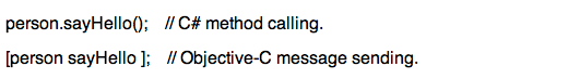 person.sayHello(); // C# method calling. [person sayHello ]; // Objective-C message sending. |