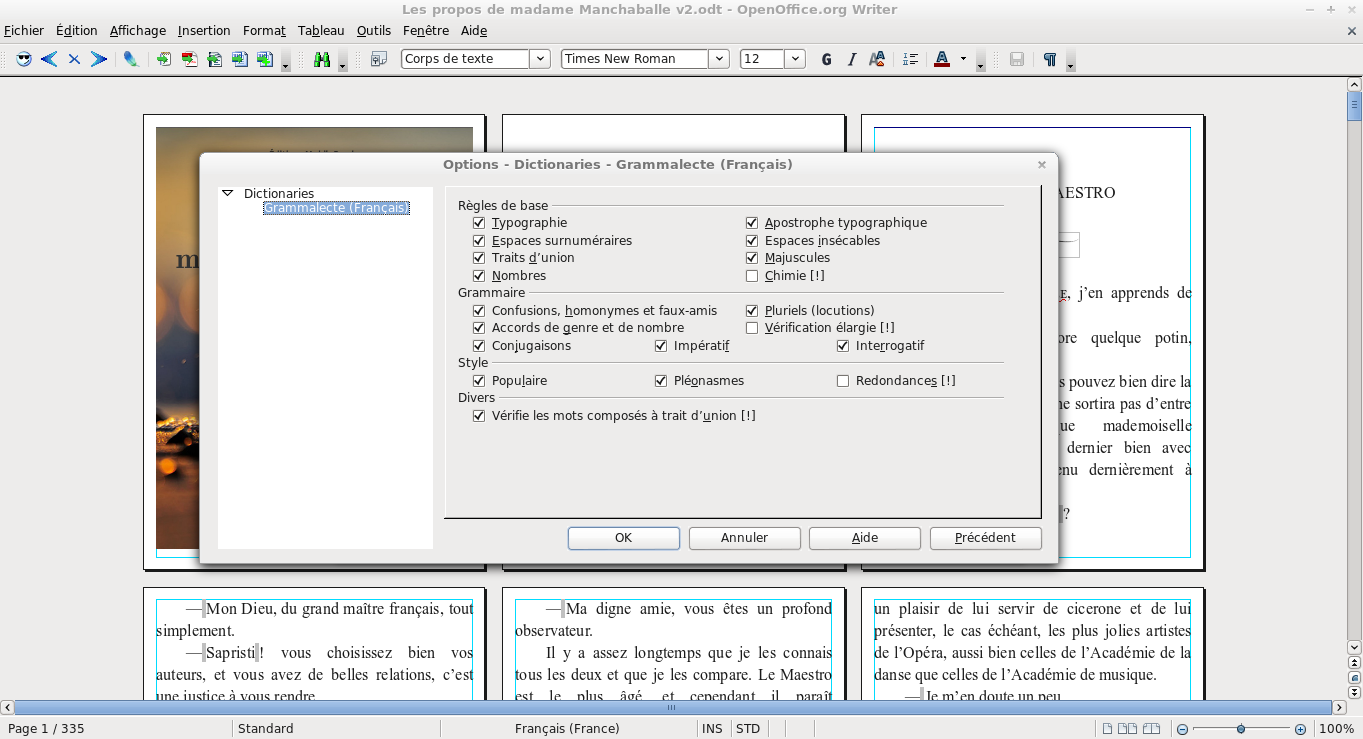 En vue de la publication sur noslivres.net, j'ai décidé de faire un toilettage - hélas nécessaire - de la série O'Monroy en matière d'orthographe et de typographie. hunspell le glouton (suite) En ce qui concerne l'orthographe, j'ai déjà revu plusieurs livres en utilisant le script minimax qui se révèle pratique d'emploi. Je n'invoque plus la fenêtre de dialogue que rarement. La liste alphabétique produite par le script met très utilement en évidence les doubles - voire les triples - graphies. Cette idée fait son chemin. La nouvelle version de Sigil (la 0.7) disposera des mêmes capacités pour les fichiers xhtml que minimax pour les fichiers odt. L'extension Grammalecte Un soin particulier doit être apporté en français aux apostrophes typographiques (U+2019). Pour ceux qui l'ignorent, l'extension Grammalecte pour OpenOffice et LibreOffice dispose d'un tableau d'options. Parmi celles-ci, vous pouvez choisir l'activation par défaut de l'apostrophe typographique en lieu et place de l'apostrophe droite. Voir image plus bas. Même si vous n'utilisez pas le correcteur grammatical (dans mon cas celui-ci n'est pas vraiment utile puisque le texte ne m'appartient pas), Grammalecte signale silencieusement avec un souligné bleu - un peu trop - discret, quelques fautes de ponctuation. Ces deux outils sont toutefois encore insuffisants... (à suivre) Last edited by roger64; 02-06-2013 at 04:44 AM. |