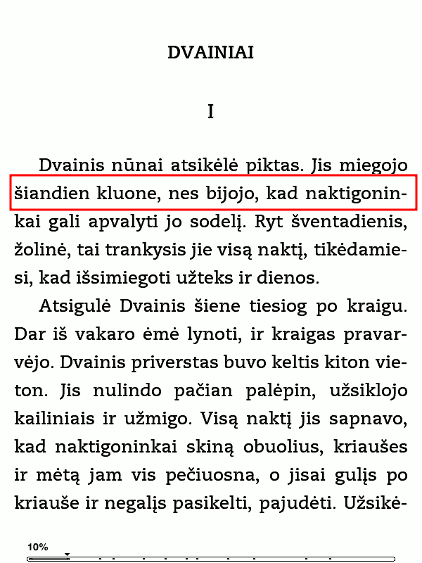 CAUTION! In versions before (and including) 0.9.26 of Calibre there is a flaw with AZW3 explosion/rebuilding. You might loose picture content. So please back-up your AZW3, if it is the only and original version of the book you have! CAUTION! In versions before 0.9.24 of Calibre there is a flaw in support of AZW3 explode and rebuild workflow. TOC might be corrupted as well as quick jump through chapters! Might not be the case for you, but be warned! Illustrations. I have added screenshots from my Kindle with English book. However, English is quite compact and hyphenation does not show all its beauty. So I've also added two screenshots with Lithuaniant text, where hyphenation is more obvious. Of course, text will look like wingdings to most of you, but just try too see the difference :-) Spoiler: