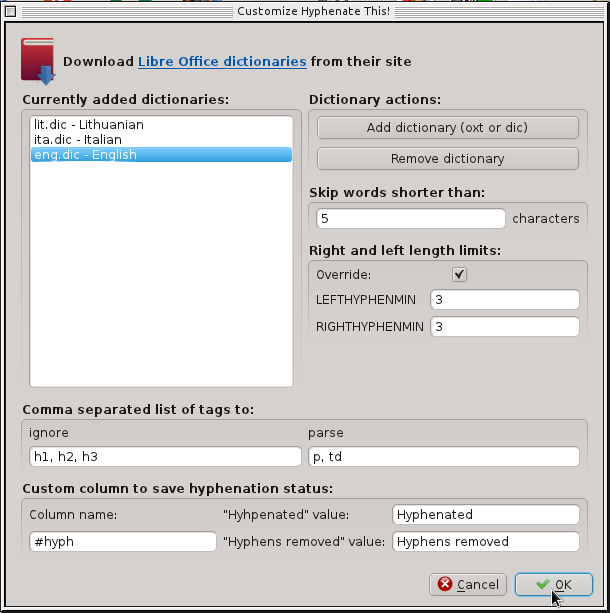 Supports EPUB and AZW3 formats (no MOBI, even with KF8 inside, convert instead). If you have a Kindle (with AZW3/KF8 support) this plugin will explode the book, add soft-hyphens and rebuild it back. Use hyphenation dictionaries from Apache OpenOffice Extensions. Download one and add to the plugin via its settings. This plugin is primarily targeted for Kindle users reading AZW3/KF8 format books, as Kindle does not support hyphenation itself. However, recent firmwares added support of soft-hyphenation. So if the book is pre-hyphenated, Kindle will display it correctly. Text search and other features remain. Note, that if you hyphenate EPUB or AZW3 and convert to "old" MOBI, hyphenation won't work. Some EPUB readers have native hyphenation, but if you read some exotic language (like me), hyphenation support might be poor or not present at all. Luckily, Libre/Open Office dictionaries are implemented for quite a lot of languages. Note. Not all EPUB readers support soft-hyphens in the way expected. Some hyphenate, but do not show dashes. Some display correctly, but lack search feature. So try it yourself and decide if it is any good. As per discussion further in this thread: