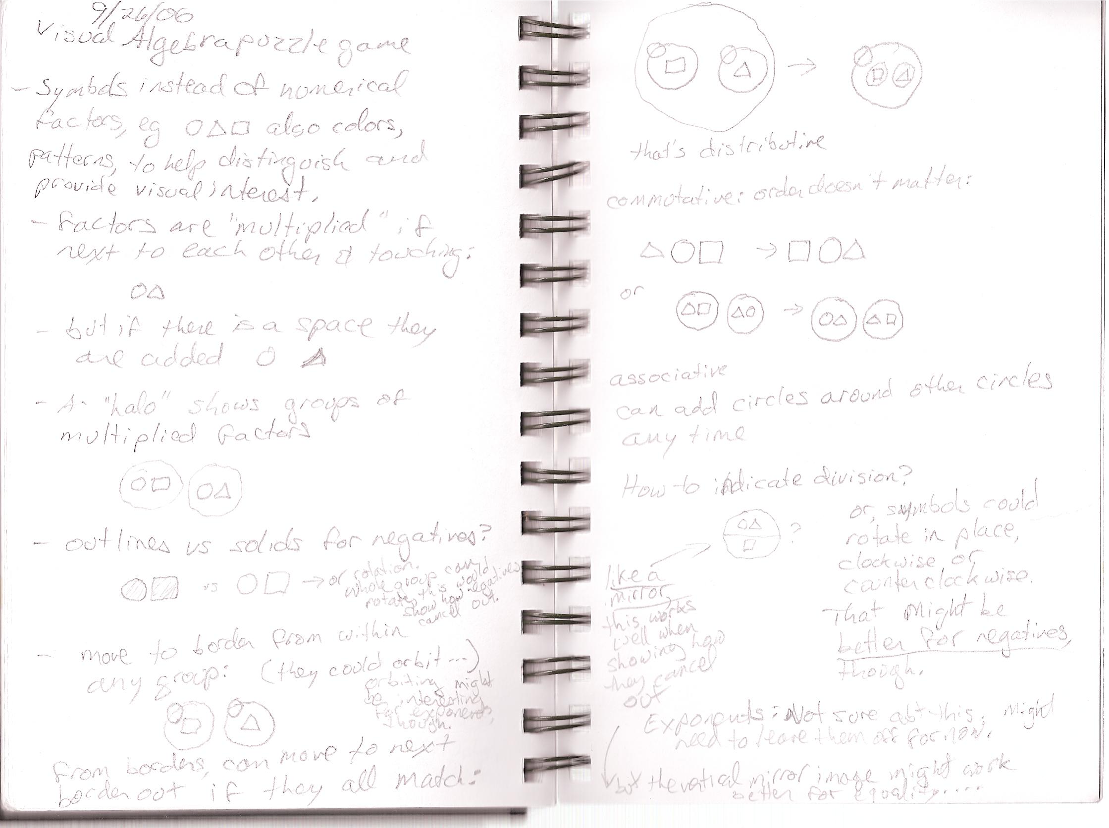 Here are a couple of sample pages from my Watson-Guptill Sketchbook: one about a game idea to teach algebraic concepts, the other about an emotional state model that might be used in a computer game to provide more interesting interpersonal reactions between the player and computer-controlled characters.