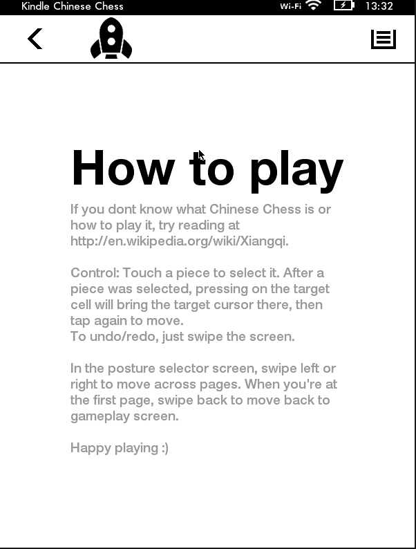 Thanks for all the feedbacks and helps! ![]() ================================================== ================ Changes in Version 0.1.3 1. Fix a bug that try to read the Security Storage while it is corrupted or absent. ================================================== ================ Install instructions 1. Delete the old file "KindleChineseChess-touch.???.azw2" from your Kindle. 2. Unzip the attached file. 3. Just copy the new file to your Kindle. ================================================== ================ |