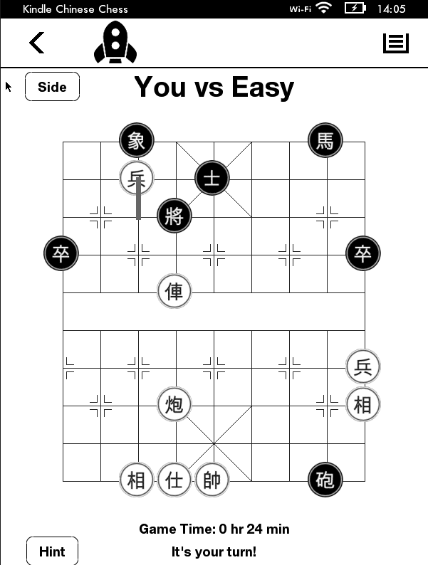 Thanks for all the feedbacks and helps! ![]() ================================================== ================ Changes in Version 0.1.3 1. Fix a bug that try to read the Security Storage while it is corrupted or absent. ================================================== ================ Install instructions 1. Delete the old file "KindleChineseChess-touch.???.azw2" from your Kindle. 2. Unzip the attached file. 3. Just copy the new file to your Kindle. ================================================== ================ |