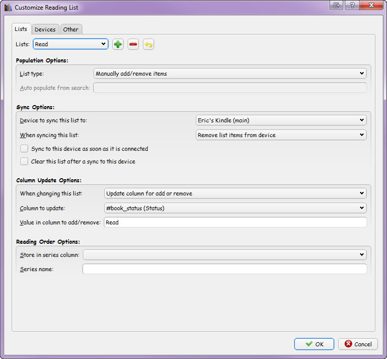 I have a fairly large collection of ebooks, so I needed a way of managing which books are on my Reader (Kindle) at any given time. I try to keep the number to around 50 at a time (just my own preference, this does not effect the setup/functionality). I also wanted to track which books I have already read. I have set up a custom column to track the Reading List to which my book is currently assigned called book_status, since for me the purpose of my Reading Lists are to track the reading status of my eBooks. The name can be changed to something more appropriate to your needs, you will just need to refer to your fields name when setting up your lists. My Reading Lists are setup so my books can only be in one list at a time. If this is not preferable for your situation, you can define the custom column as a 'Tag like' text column instead. I have three Reading Lists setup: Shelf: These are the eBooks I currently have on my Reader. Adding a book to this list will queue it to be added to my Reader the next time I do a Reading List sync. Read: These are the eBooks I have read. Adding a book to this list will queue it to be removed from my Reader the next time I do a Reading List sync. Remove: These are eBooks I have not read, but wish to remove from my Reader. Adding a book to this list will queue it to be removed from my Reader the next time I do a Reading List sync. This list will be cleared after the sync. Another great plug-in to have, which works great with the Reading List plug-in, is the Kindle Collections plug-in by @meme. @kiwidude as added hooks in Reading List to call Kindle Collections when a Reading List sync is performed, which is device/reader specific. Once you install Kindle Collections, go to the Reading List Devices tab and you will be able to set the Kindle Collections column to either Y (call Kindle Collections during sync) or N (don't). Screen Shots: |