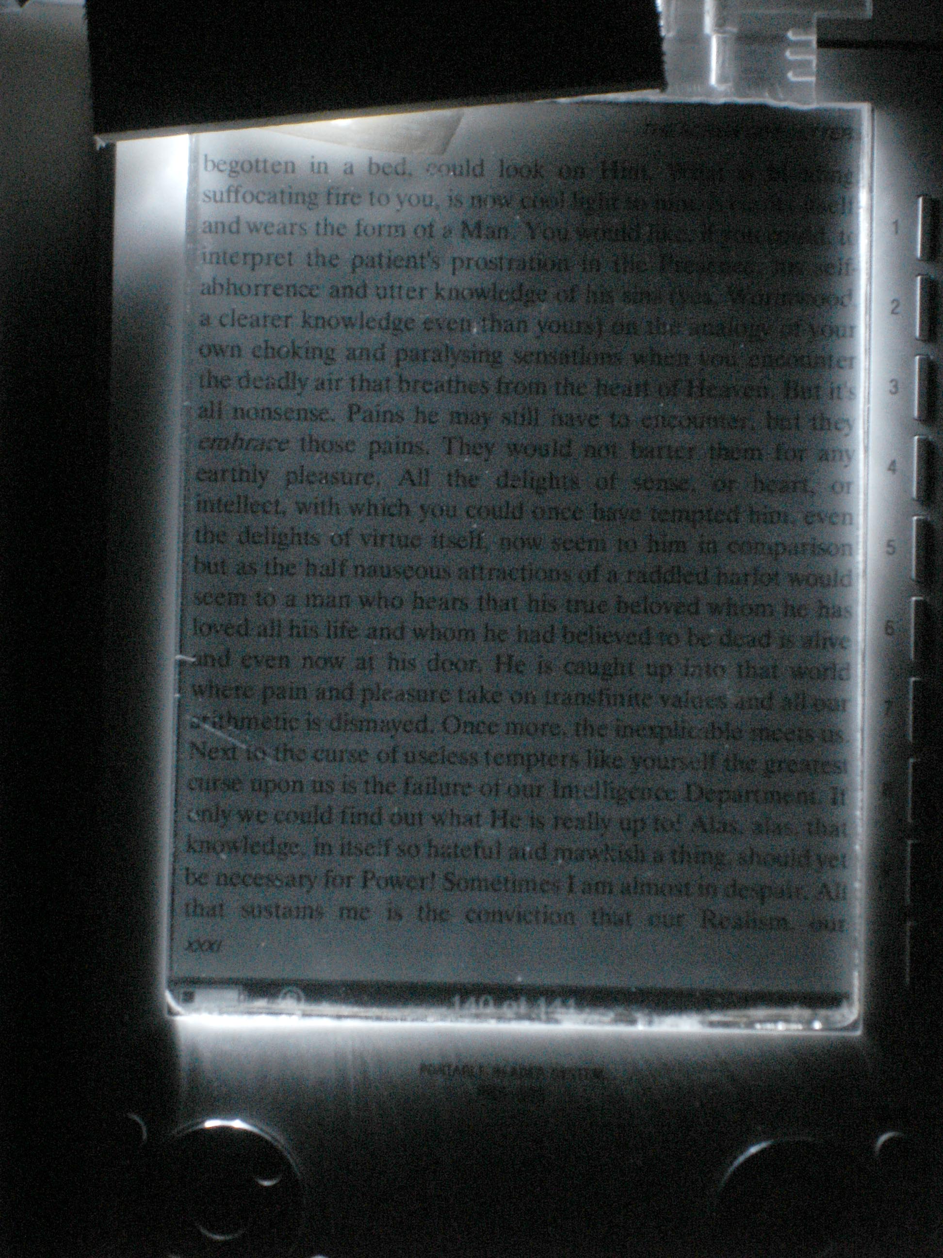 I am currently manufacturing my second light-wedge derived book-light for my 505. The first one met an untimely end when i tried to bake the polymer clay i used to make the battery holder. I was about 75% sure that it would get soft... but what i didn't count on is that the tempering process used in the book light causes the plastic to contract in strange ways... It was extra industrial grade short bus riding special. luckily for me the only light wedge I could buy in a store around here was at office depot, and was the full sized monster, so i have another peace large enough, and a 1" strip of material to do manufacturing tests on.