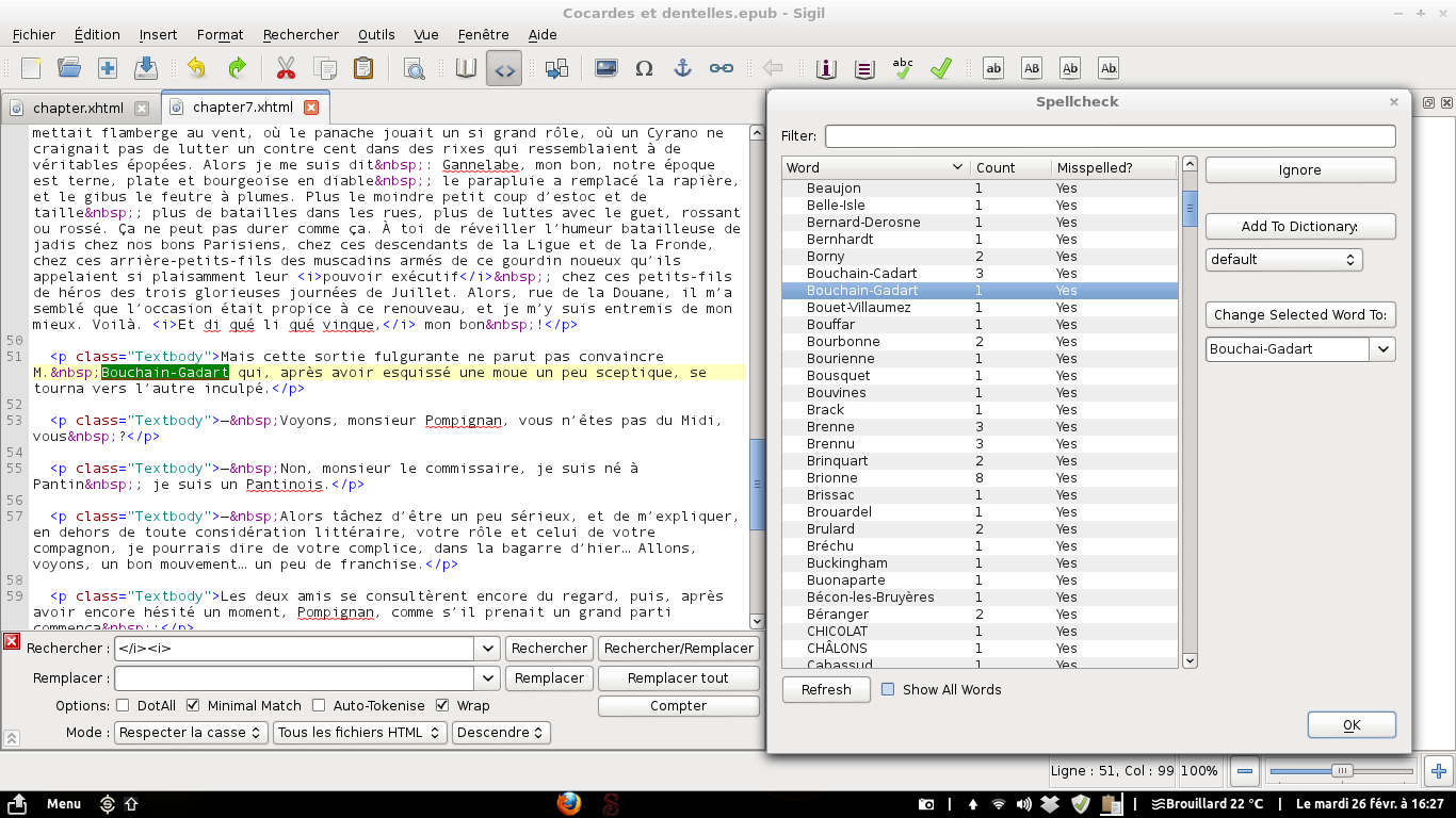 En vue de la publication sur noslivres.net, j'ai décidé de faire un toilettage - hélas nécessaire - de la série O'Monroy en matière d'orthographe et de typographie. hunspell le glouton (suite) En ce qui concerne l'orthographe, j'ai déjà revu plusieurs livres en utilisant le script minimax qui se révèle pratique d'emploi. Je n'invoque plus la fenêtre de dialogue que rarement. La liste alphabétique produite par le script met très utilement en évidence les doubles - voire les triples - graphies. Cette idée fait son chemin. La nouvelle version de Sigil (la 0.7) disposera des mêmes capacités pour les fichiers xhtml que minimax pour les fichiers odt. L'extension Grammalecte Un soin particulier doit être apporté en français aux apostrophes typographiques (U+2019). Pour ceux qui l'ignorent, l'extension Grammalecte pour OpenOffice et LibreOffice dispose d'un tableau d'options. Parmi celles-ci, vous pouvez choisir l'activation par défaut de l'apostrophe typographique en lieu et place de l'apostrophe droite. Voir image plus bas. Même si vous n'utilisez pas le correcteur grammatical (dans mon cas celui-ci n'est pas vraiment utile puisque le texte ne m'appartient pas), Grammalecte signale silencieusement avec un souligné bleu - un peu trop - discret, quelques fautes de ponctuation. Ces deux outils sont toutefois encore insuffisants... (à suivre) Last edited by roger64; 02-06-2013 at 04:44 AM. |