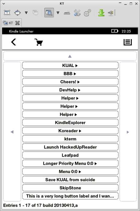 The sort option button not working is exactly that; not working I had accidentally commented out its code. I put it back and improved it. Will be in my next commit.The borky KUAL config hits a java exception handler (you can see it in the trail line pics 6/7/etc.) Hopefully I will be able to reproduce this exception with the file you attached. KUAL_nofollow regards hard/soft link files. It has no effect on files in /mnt/us as that's a FAT partition. I use this setting just on my PC for testing purposes. The four-line message area looks kind of ugly on the PW wrt the KT (pic 10, I think, where it reports that the Store button was restored). I might look into moving that message to the trail line instead (priority="nice to have"). |