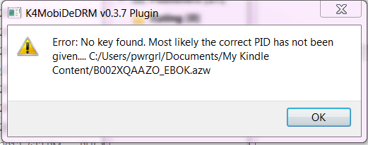 I have added my Kindle SN (which I think should work instead of a PID) and repeatedly get this message for any azw file. Is it a plug-in problem? I checked the device interface plug-in and this file should be recognized. I have repeatedly had issues with books from Amazon and none from any other source. I'd appreciate any insight!