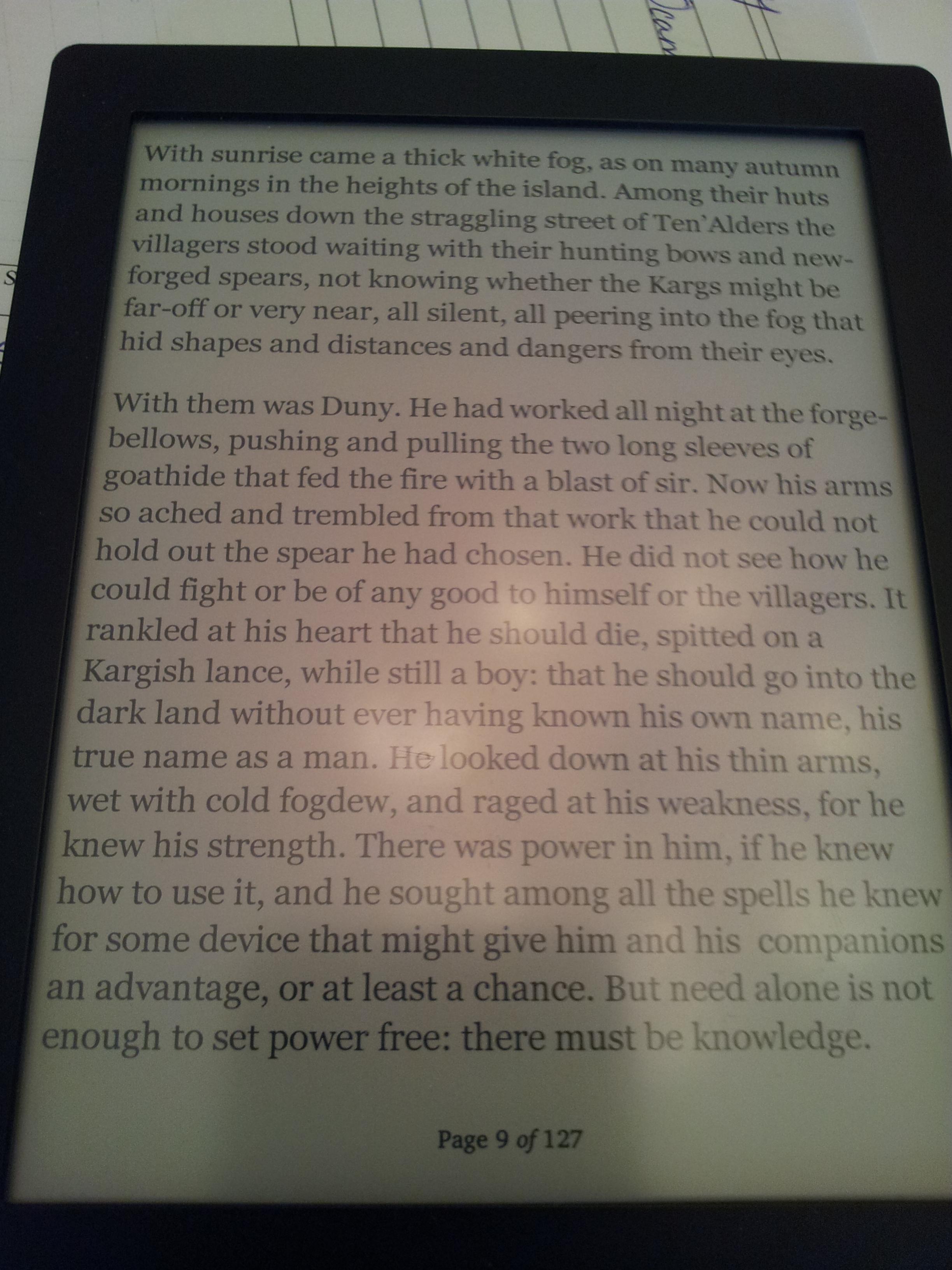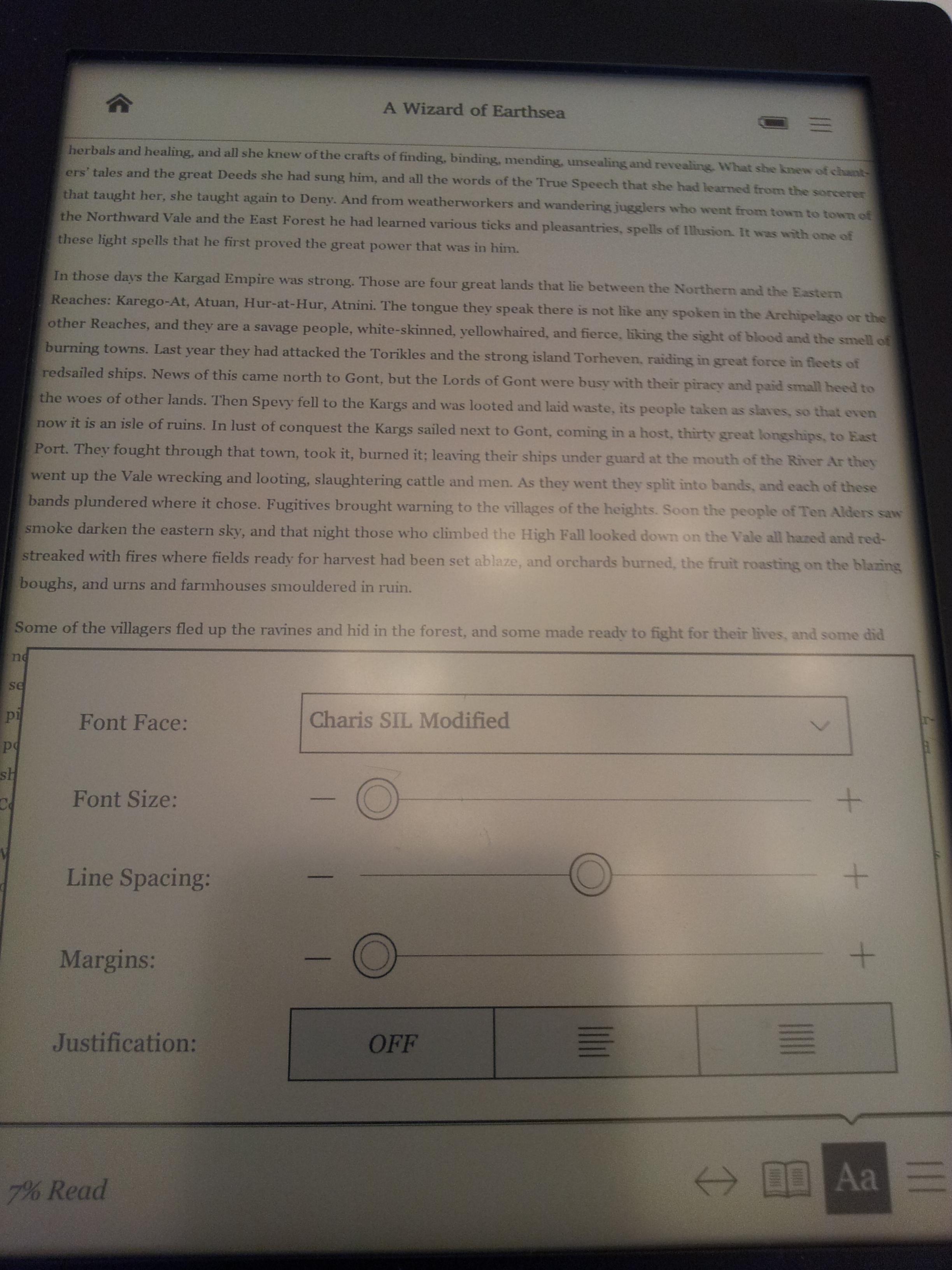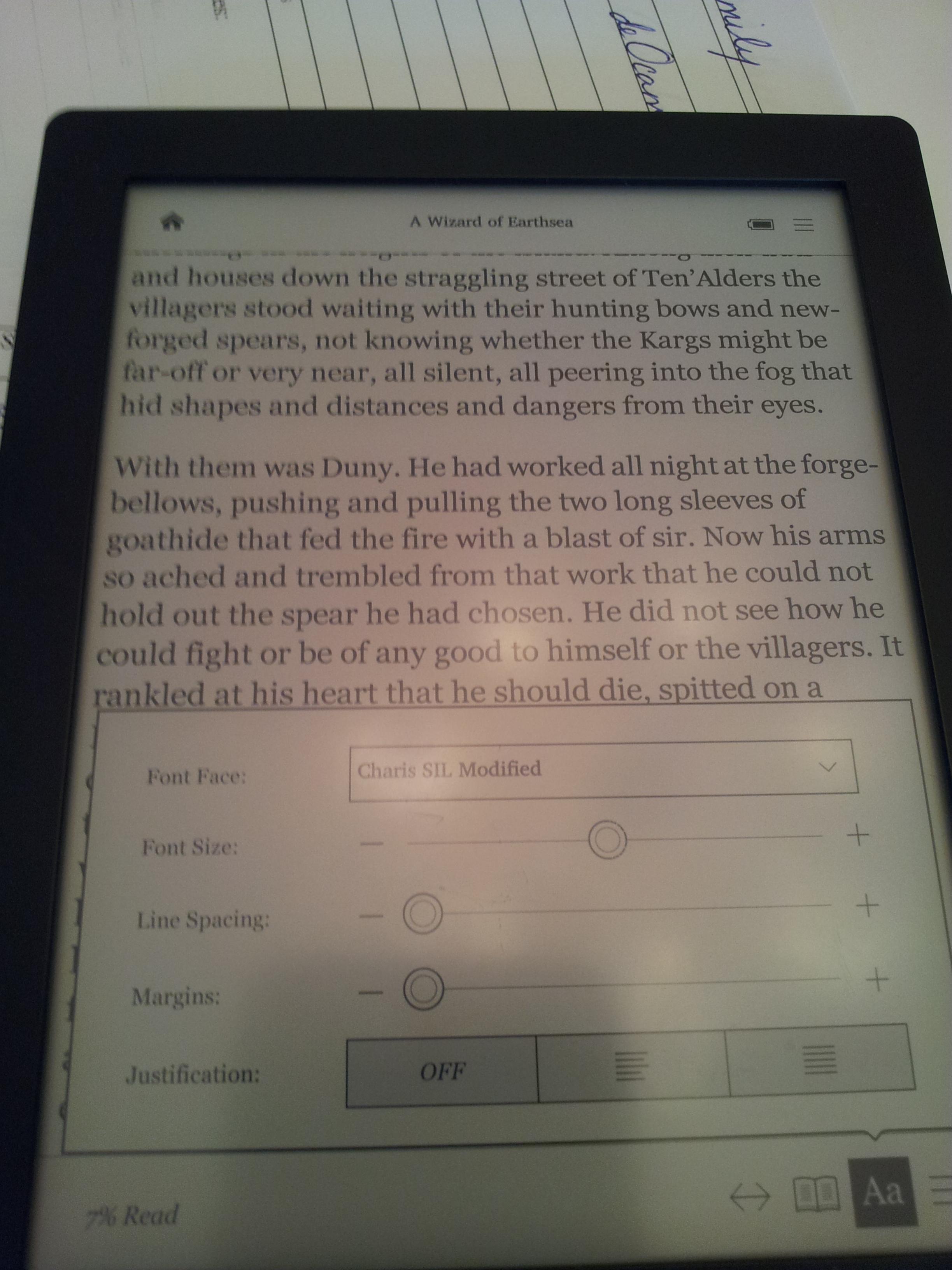 Let me know if there are different settings or another ebook you want me to try. This was a sideloaded, drag and drop epub. S PS: and now I know how to install fonts WOO HOO! |