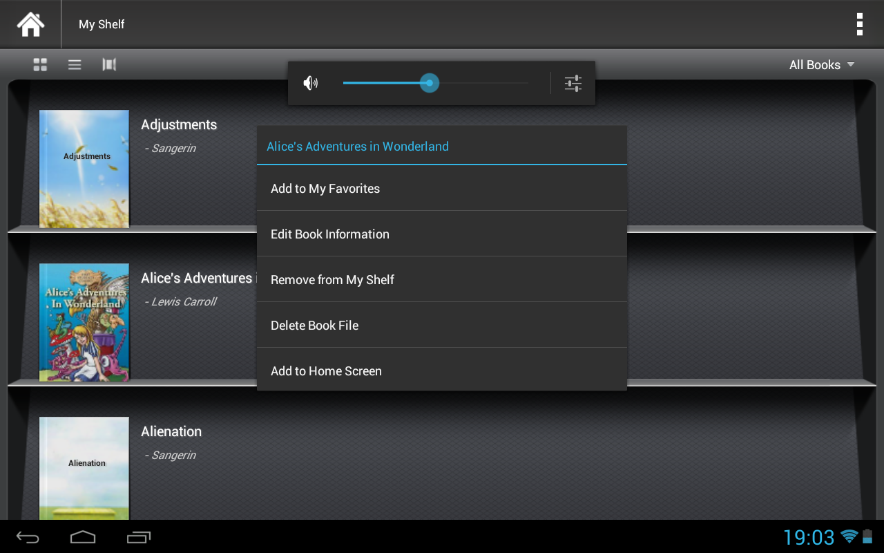 Here's what you see when you go to "My shelf" and long press on a book: Add to my favorites, Edit book information, Remove ffrom my shelf, Delete book file, Add to home screen. Choosing Edit book information, you get another window that enables you to change Book title, Book author, Description, and various Labels: Tags, and Favorite, where you can add a Category. As Teknikal noted too, there is indeed no way to edit series info unless you add it to the file name/title manually or in calibre. I thought there was, so I stand corrected. |