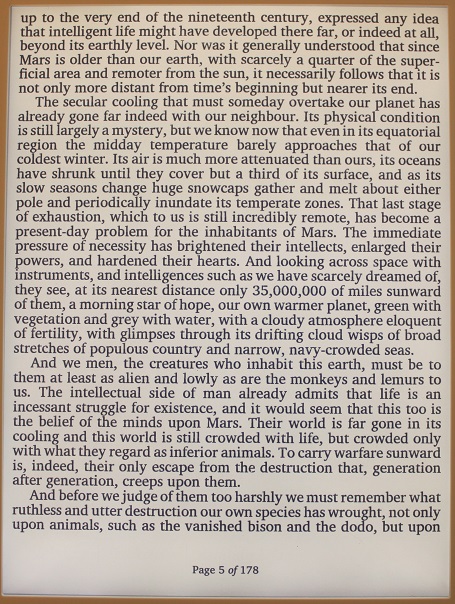 ) Note the paper back is only 55 characters per line and 37 lines to the page, the font does look slightly larger on the paperback and the line spacing is significantly greater than it is on the epub.The shot of the Aura HD has the menu showing so you can see how much space is available at the bottom between the last line of text and the line where the bottom menu starts, not quite enough for another line I don't think. Though to be honest I don't see why it can't be set for the menu to overlap the text at the bottom anyway (it already does on the top of the page) so you wouldn't be able to select the hidden text at the top of the page for highlighting for example so not sure what difference it would make if it over lapped the text on the bottom as well. Edit: just realized that the last part of my statement really isn't correct, as when selecting text the top menu disappears so you can select that text. I'll use the excuse that it is way past my bed time