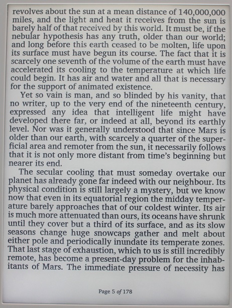 Just tried War of the Worlds on my Kobo Glo as well and it looks very different with a much smaller font size and the left and right margins are non existent with the text right up beside the edge of the screen.
