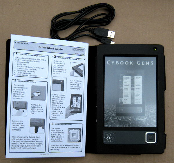 I've attached the obligatory unwrapping photos. There are four things in the box 1. CyBook 2. Black Leather Case 3. USB Cable 4. Quickstart Instructions In short, everything you need and nothing you don't. (USB Chargers, headphones and SD Cards being completely standard items.) Getting the leather case included is wonderful. A great bargain. I wonder how long it'll take them to get more stock in hand. Paul |