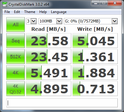 I've attached 3 images from various Crystal DiskMark tests I ran on microSD cards (Lexar Class 10, Patriot Class 10 and a SanDisk Class 4 all 8GB) using the internal card reader on my laptop. In my digital and video cameras, the two Class 10 cards worked well. In my Glo, they made it noticeably slower. I suspect this is due to the small block writes where the Class 4 SanDisk was 65 to 171 times faster. The similarity of the sequential read speeds is, I suspect, a limitation of the Ricoh chip used for the card reader. Regards, David Last edited by DNSB; 05-05-2013 at 02:46 AM. |